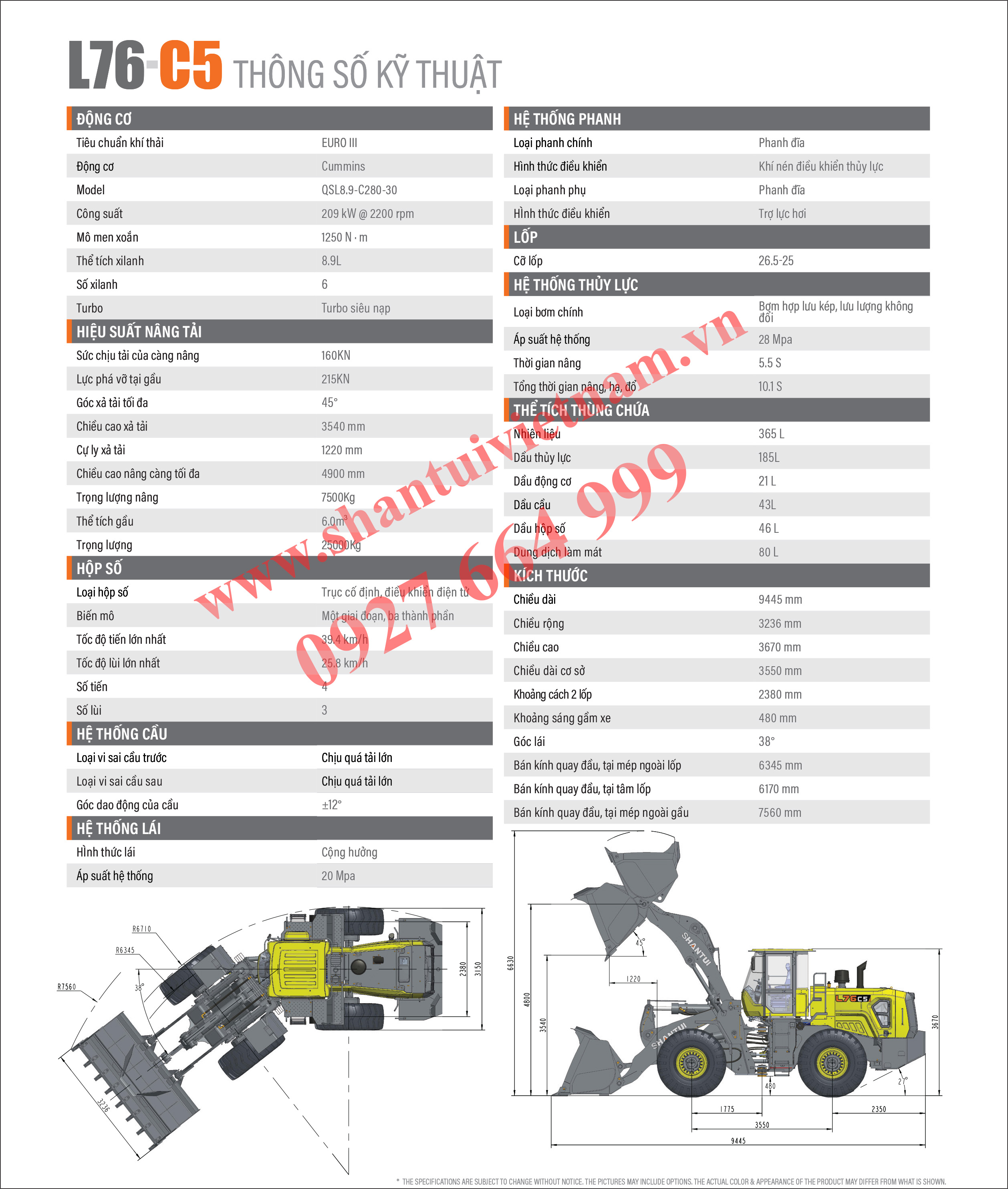 • Tải trọng định mức để máy có thể bốc xúc an toàn: 7500Kg.